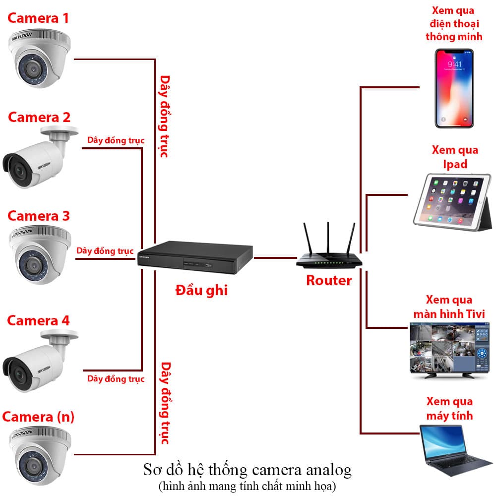 - Hệ thống camera analog : Là hệ thống camera quan sát mà từ vị trí camera kết nối truyền tín hiệu về đầu ghi bằng dây cáp đồng trục,tín hiệu truyền dạng tương tự.